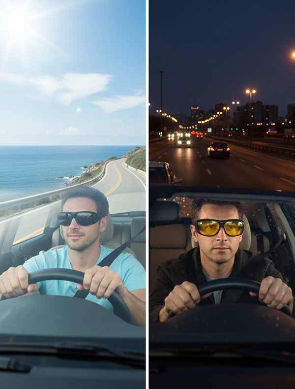 ✔️ عدسات ليلية صفراء: بتقلل التوهج من أنوار العربيات وتوضحلك الطريق في الضلمة والمطر والضباب